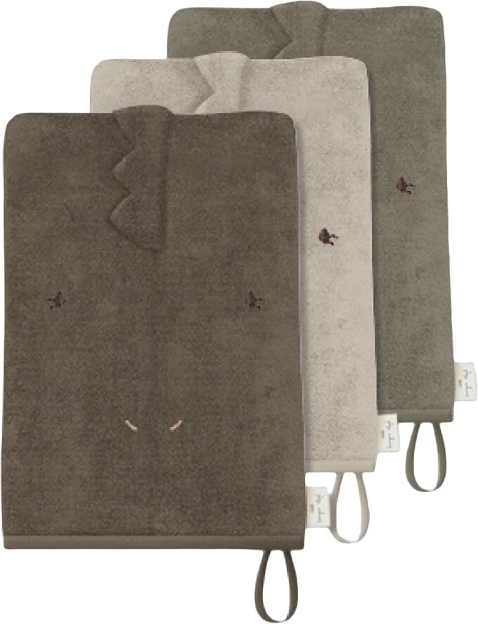 “Animal shaped terry washcloth made in 100 percent organic cotton.”