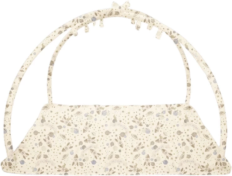 Activity blanket made in 100 percent cotton with 100 percent recycled polyester filling. The detachable arch attaches to the blanket with velcro and is designed with loops to hang activity toys made for interactive play. Measurements- 90 x 90 cm