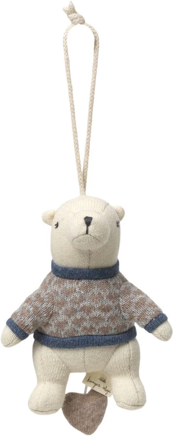 “Activity music polar bear Activity music polar bear made in 80 percent lambswool and 20 percent nylon playing the melody Its a small world. Designed with a knitted hanger loop and a wooden ring easy for little hands to grasp. Plays IT’S A SMALL WORLD”
