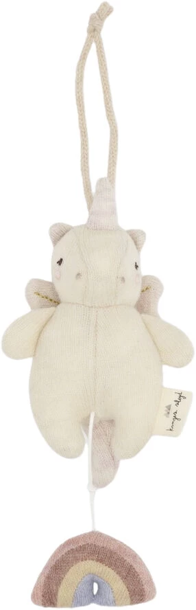 “Activity music unicorn made in 80 percent lambswool and 20 percent nylon playing the lullaby Frere Jacques. Designed with a knitted hanger loop and a rainbow easy for little hands to grasp.”