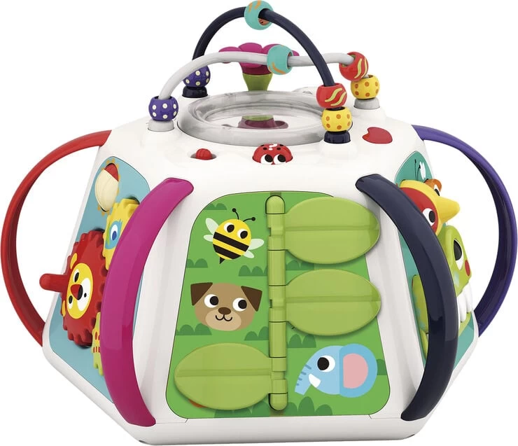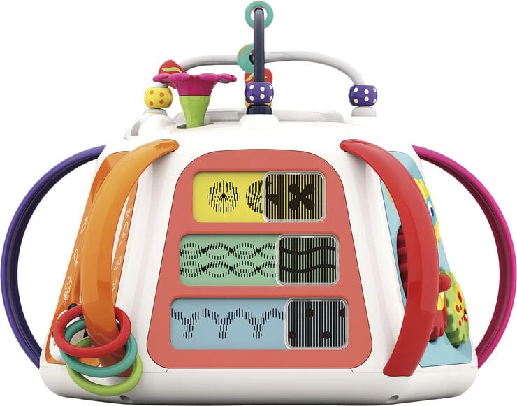 Stor aktivitetspyramide med musik, lys og lyde Med 18 forskellige aktiviteter Feks LED-ring der lyser i forskellige farver når funktioner aktiveres, sjove lyde og melodier, matchspil med dyrelyde, roterende tandhjul med melodier, tegnetavle mm Bruger 3 stk AA-batterier