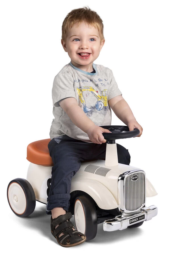 B BEEZ retro gåbil Robust gåbil med bredt sæde, lyddæmpede og brede skridsikre hjul for bedre stabilitet og sæde med opbevaringsrum Styrhøjde ca 36 cm Siddehøjde ca 26 cm 36x58x26cm Kan bære 25 kg