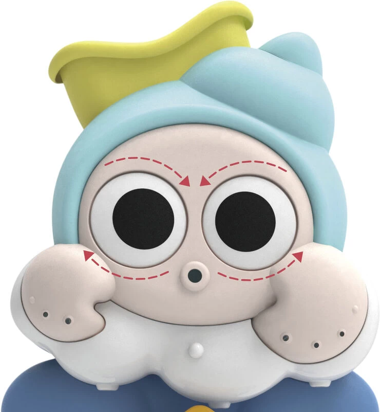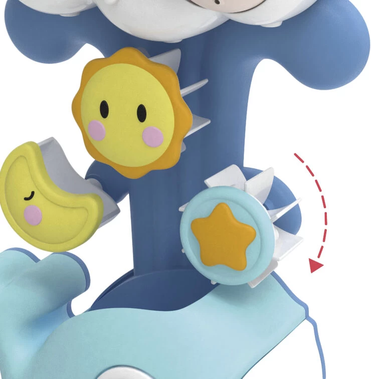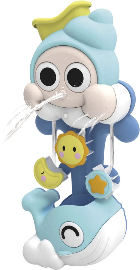 Vandlegesæt Sæt fast med sugekoppen, hæld vand i og øjnene ruller, der kommer vand ud af mund og hænder, hjulene drejer og det regner ud af skyen