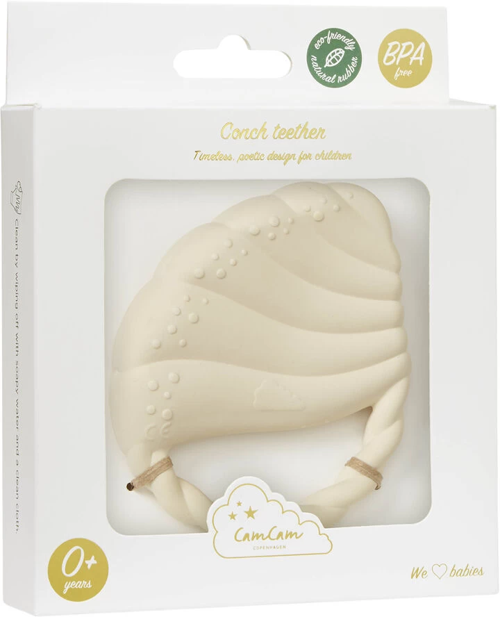 Naturgummi Bidering designet med form som en smuk konkylie, der matcher vores Seabed og Sailboats temaer perfekt. Konkylie Bideringen, der er fremstillet af ren naturgummi fra Hevea gummitræer, er designet med mange forskellige teksturer skabt til at lindre ømme gummer og stimulere babyens syns-, smags- og taktile sans. Bideringen er fleksibel og blød at røre ved samt tygge på, og formen er nem for små hænder at gribe fat i og holde. Hypoallergisk og designet uden huller for at forhindre bakterier og mug. Bideringen er fuldstændig fri for BPA og PVC.