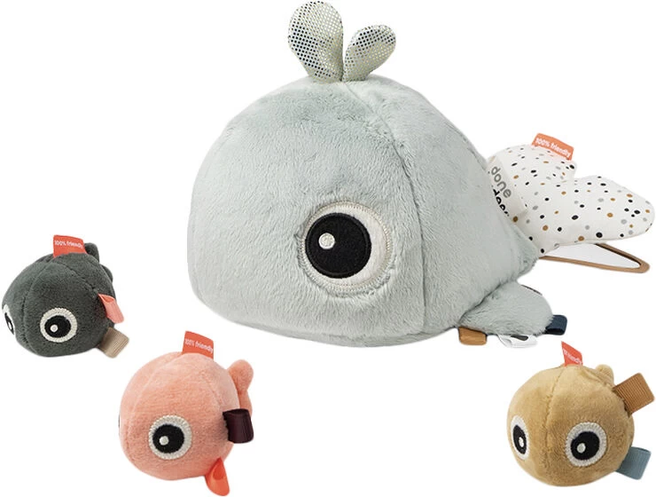 Den legesyge hval elsker at lege gemmeleg. Du skal være hurtigt for at følge med de små fiskevenner – de gemmer sig hurtigt inde i Wally. Hver fisk har sin egen lyd som vil give de små lyst til at kravle efter dem. De små kan opdage hvordan de søde fisk kommer ind og ud af Wallys mave, mærke de forskellige teksturer på den søde hval og opdage et skjult spejl under Wallys hale. De farverige mærker og søde dråber på Wallys hoved gør det svært at holde fingrene væk. Aktivitetslegetøjet vil underholde småbørn, mens de udvikler deres koncentrationsevner og hånd-øje-koordination. Den superbløde hval er mintblå og dens hale er dækket af spændende prikker. De små legesyge fiskevenner har hver sin farve.