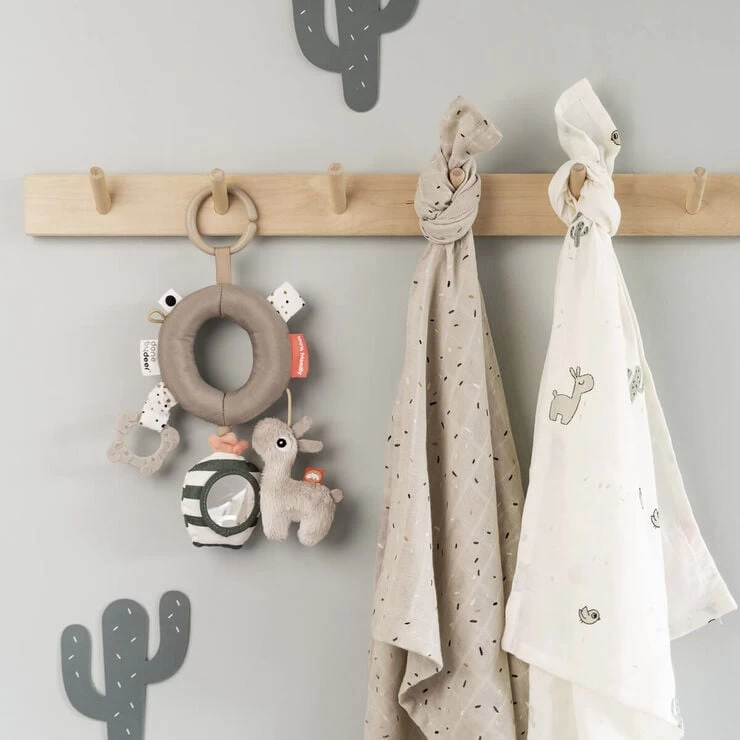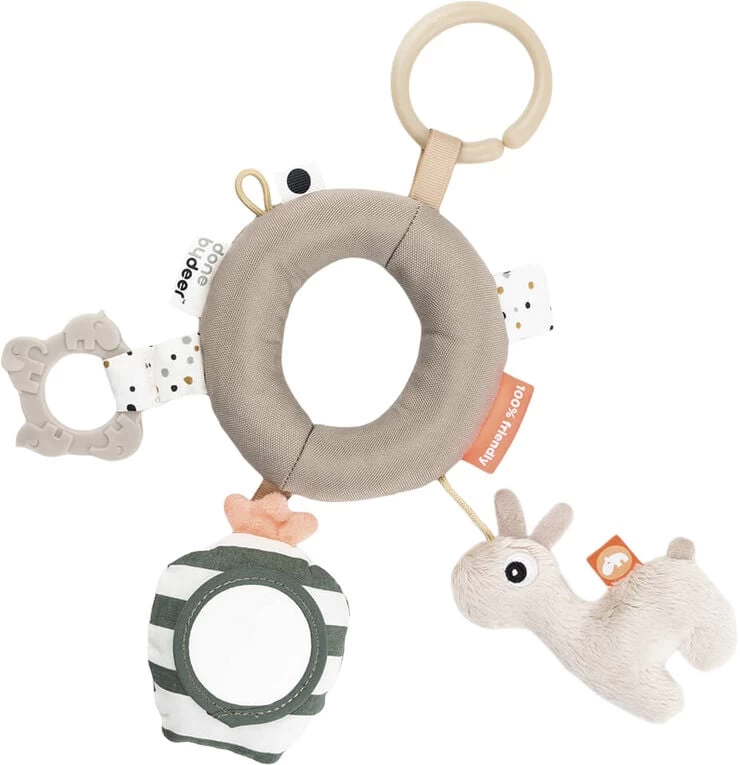 Aktivitetsringen opmuntrer babyer til at være nysgerrige og undersøge sansefunktionerne: en blød bidering til lindring af ømme gummer, et spejl med rangle, en blød Lalee, knitrelyde og sjove tags. Legetøjet er let at holde om for små fingere og elastikringen kan holde en sut eller et andet stykke legetøj indenfor rækkevidde. Brug toy linket til at fastgøre aktivitetsringen til fx. en legemåtte, aktivitetsbue, klapvogn, autostol eller babyseng.