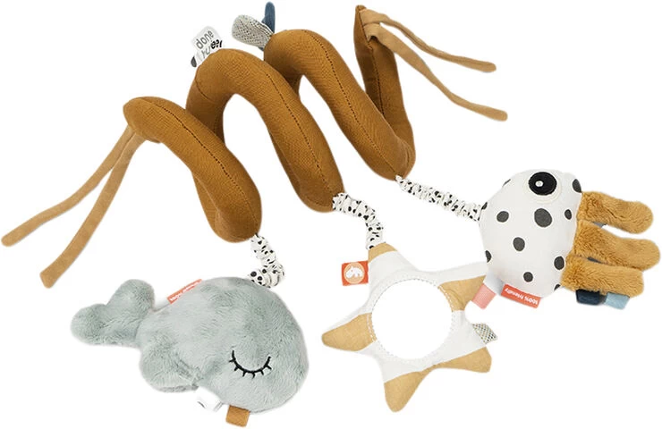 Lad de små fingre og øjne udforske den søde Sea friends aktivitetsspiral. Den er perfekt til underholdning på farten da den er fuld af sensoriske indtryk som de små kan nyde. Wally vil begejstre med bløde detaljer og en sød klokkelyd. Det lille søstjernespejl er perfekt for de nysgerrige at udforske, og dets søde rasle lyd vil helt sikkert vække lykkke. Små fingre vil elske at gribe fast i Jellys bløde arme, når på tur. Sea friends-spiralen er mustardfarvet med mintblå detaljer og kontrastrige prikker og striber. Den fleksible aktivitetsspiral kan fastgøres til barnesengen, autostolen, barnevognen eller på siden af en kravlegård.