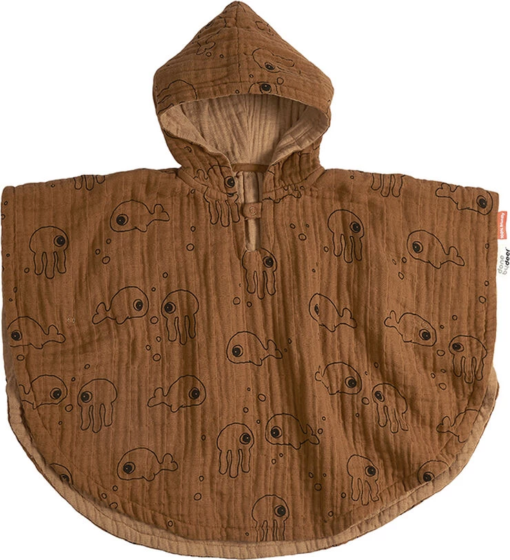 Dyk med ned i et hav af bløde badetekstiler, når Jelly og Wally inviterer dig med under havets overflade. Den dejlige poncho er skøn at hygge i efter et dejligt bad eller perfekt at tage med på strandeventyr. Ponchoen, som er med hætte, er sammensat af flere lag af blødt musselin-vævet bomuld, der føles behageligt på huden og bliver kun blødere, når det vaskes. Trykknapper under armene sikrer, at poncho sidder godt.