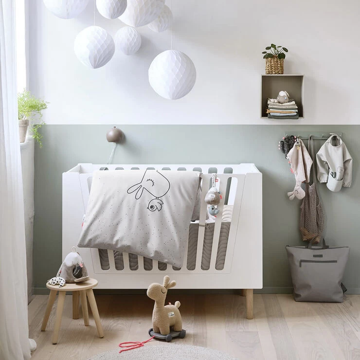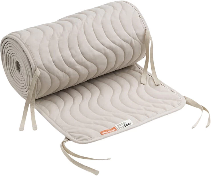 Den quiltede sengerand i blødt økologisk bomuld har et let polyesterfyld, der beskytter dit barns hoved, når der tumles rundt i tremmesengen. Sengeranden er perfekt til at indrette en hyggelig seng og matcher sengetøjs-kollektionen fra Done by Deer. Den bløde sengerand har praktiske bånd, der gør det nemt at fastgøre den til tremmesengen. Sengeranden måler 360 cm., hvilket gør den velegnet til de fleste babysenge. Lad din baby rejse til drømmeland omkranset af den sandfarvede sengerand i det fine, quiltede Waves mønster. Sengeranden kan vaskes ved 30 grader i vaskemaskinen.