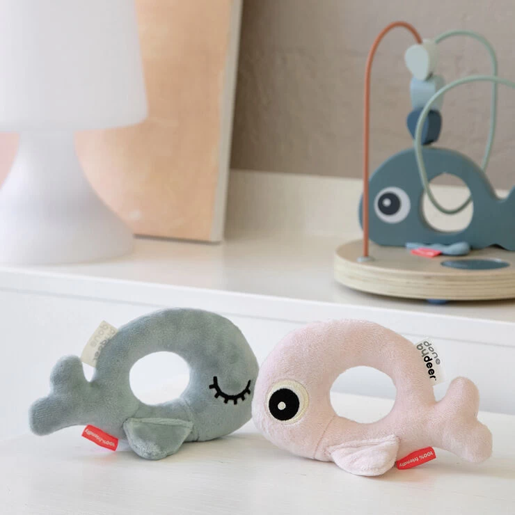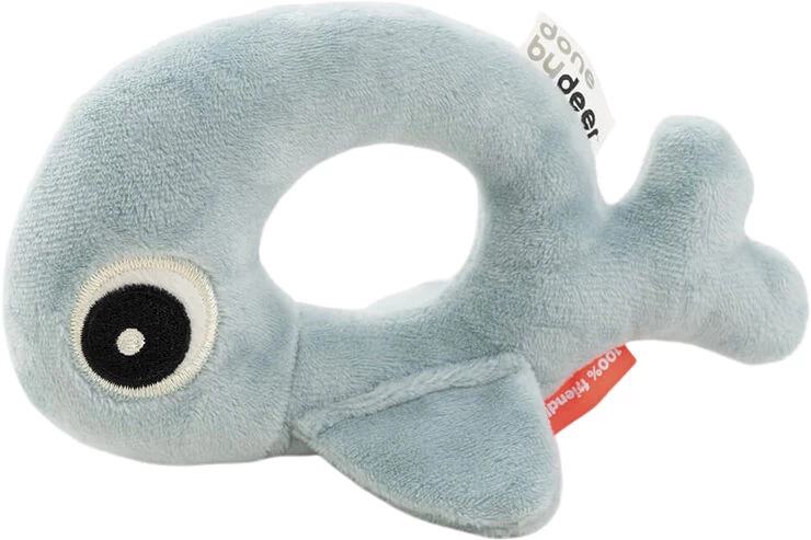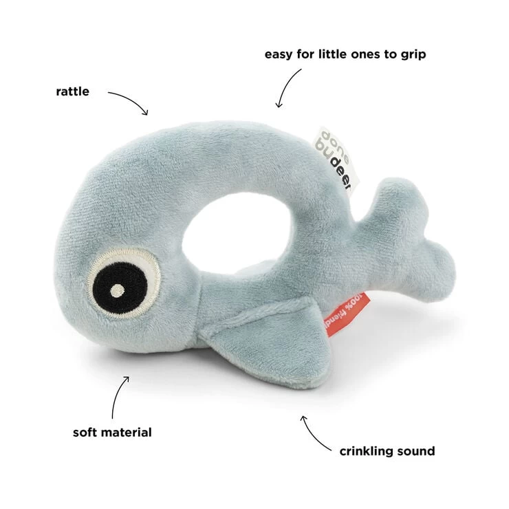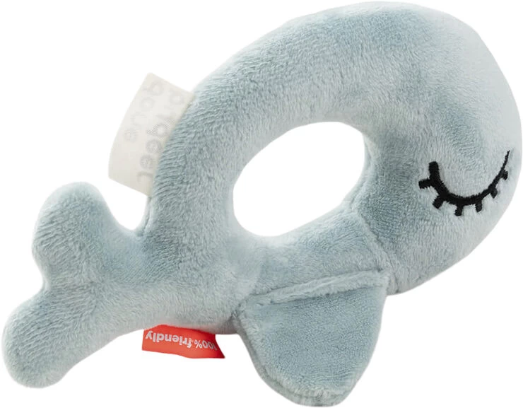 Denne runde rangle med Wally har potentialet til at blive din babys bedste ven. Det store hul i Wallys mave, gør det let for små hænder at gribe om ranglen og de sjove lyde vil underholde din baby. Den bløde ringrangle laver en sød ranglelyd, når den rystes, og finnerne laver en sjov knitrelyd, når man rører ved dem. Finnerne gør det muligt for ranglen at stå selv og er perfekt til leg på maven. Underhold din baby med denne søde, blå ringformede rangle og dens mange funktioner. På den ene side er Wally’s øje lukket, og på den anden side er Wally vågen og klar til at lege.