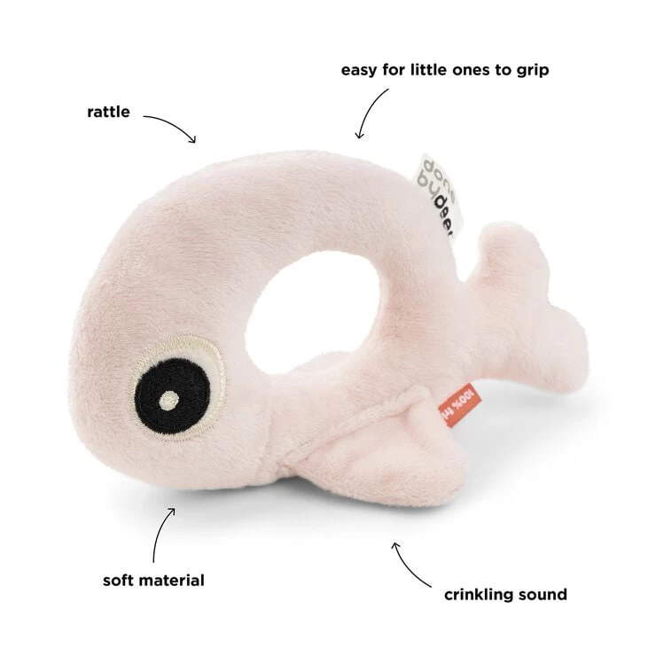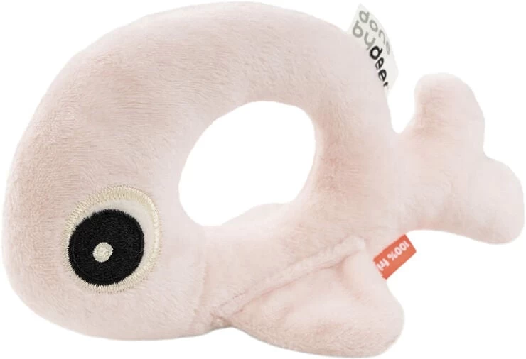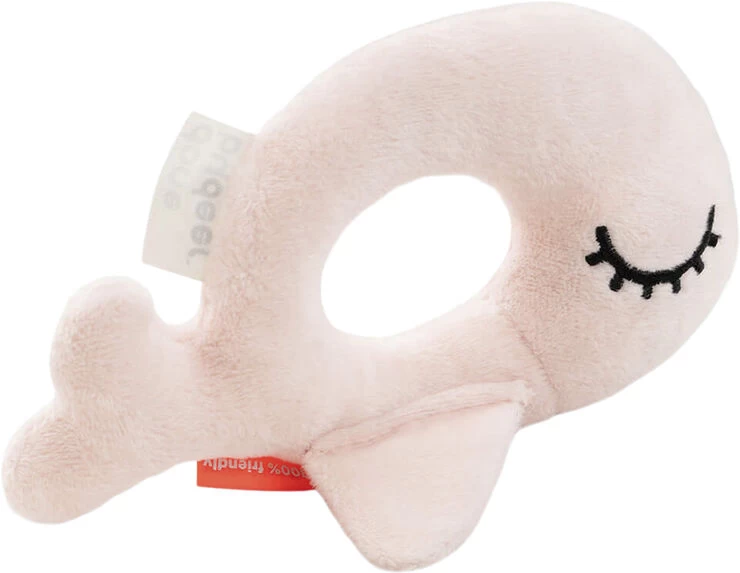 Denne runde rangle med Wally har potentialet til at blive din babys bedste ven. Det store hul i Wallys mave, gør det let for små hænder at gribe om ranglen og de sjove lyde vil underholde din baby. Den bløde ringrangle laver en sød ranglelyd, når den rystes, og finnerne laver en sjov knitrelyd, når man rører ved dem. Finnerne gør det muligt for ranglen at stå selv og er perfekt til leg på maven. Underhold din baby med denne søde, pudderfarvede, ring-formede rangle og dens mange funktioner. På den ene side er Wally’s øje lukket, og på den anden side er Wally vågen og klar til at lege.