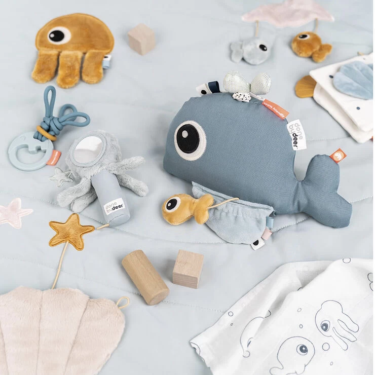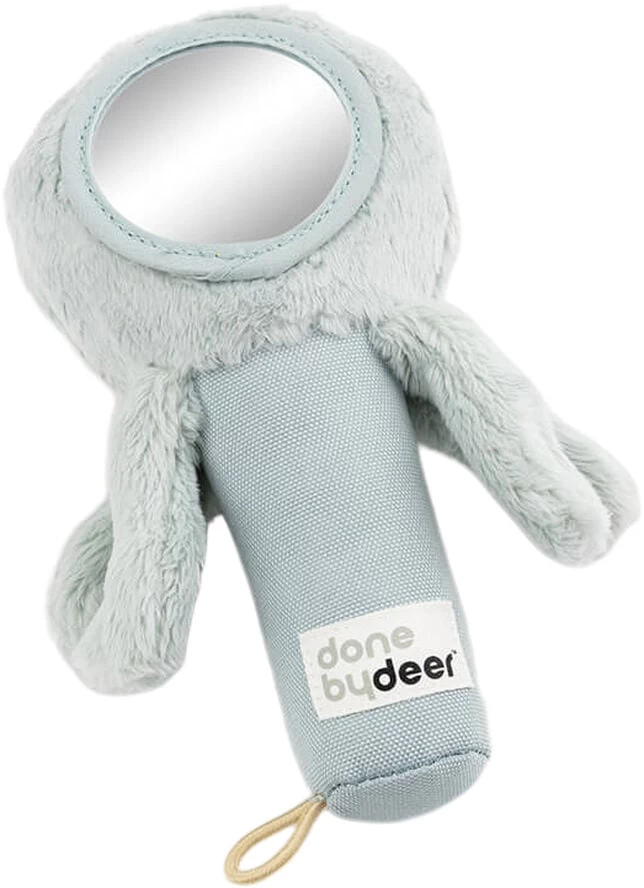 Jelly sanseranglen med spejl er fyldt med stimulerende features, der er sjove at udforske for de nysgerrige små. Lad din baby smile tilbage til sit eget spejlbillede i dette fantastiske babylegetøj. Jelly-ranglen har bløde, sansestimulerende ben der knitrer når de udforskes af små nysgerrige hænder. Håndtaget er nemt for de mindste børn at gribe om, og når det får et klem, laver det en sjov piv-lyd. Ryst den lille vandmand og ly til den søde rangle. Den bløde Jelly rangle er i en skøn, lys havblå-farve.