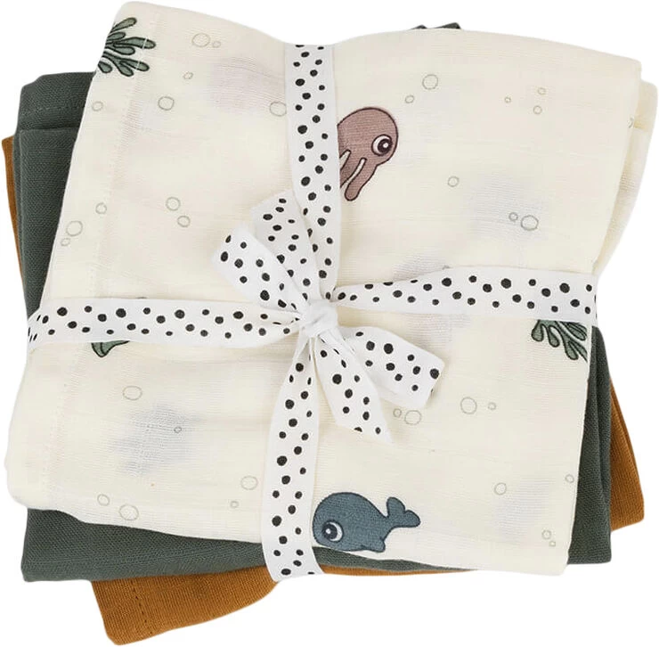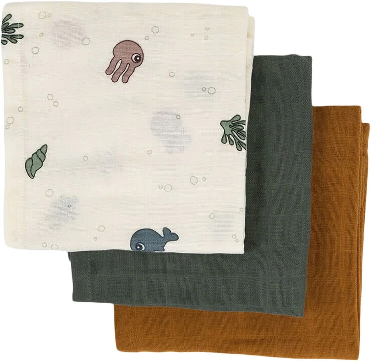 Sættet med tre stofbleer er i et mix af to ensfarvede og en med et sødt Sea friends print med hvalen Wally, vandmanden Jelly og havelementer