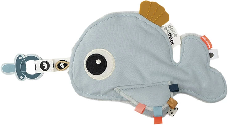 De små kan putte sig ind til bløde og trætte Wally. De små fingre kan nemt fange Wallys bløde hale og finner og udforske de farverige mærker og forskellige teksturer og former. Den søde silikone bidering stimulerer og beroliger gummer, som klør. Den søde hval sørger for at sutterne altid er inden for rækkevidde, både til sovetid og på farten. En praktisk Velcro holder og elastik-løkke kan holde styr på sutter både med og uden hank. Den beroligende Sea friend er en perfekt ledsager for din lille baby. Suttekluden er blå og vil stimulerer babys sanser.