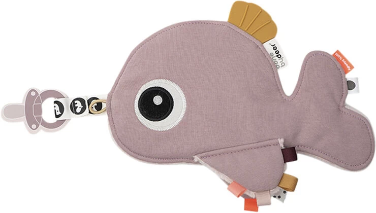 De små kan putte sig ind til bløde og trætte Wally. De små fingre kan nemt fange Wallys bløde hale og finner og udforske de farverige mærker og forskellige teksturer og former. Den søde silikone bidering stimulerer og beroliger gummer, som klør. Den søde hval sørger for at sutterne altid er inden for rækkevidde, både til sovetid og på farten. En praktisk Velcro holder og elastik-løkke kan holde styr på sutter både med og uden hank. Den beroligende Sea friend er en perfekt ledsager for din lille baby. Suttekluden er pudderfarvet og vil stimulerer babys sanser.