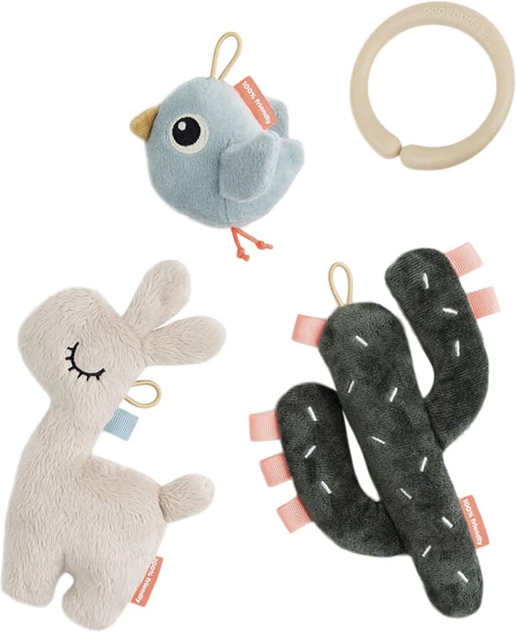 Tiny sanselegetøjssættet med Lalee er et perfekt begynder-sæt for en lille ny. Den bløde Lalee har en sjov rangle, den sansestimulerende kaktus med farverige mærker er nem for små hænder at udforske og det lille Birdee legetøj har en sød klokke gemt i maven. Legetøjssættet med 3 sjove og sansestimulerende babylegetøj er i farverne grøn, blå, sand samt et strejf af koralrød.