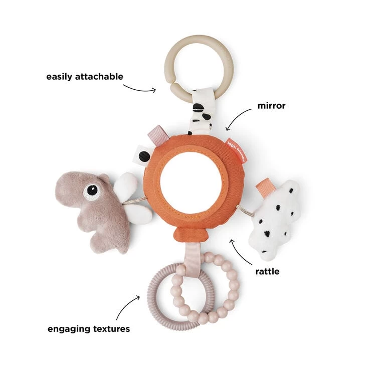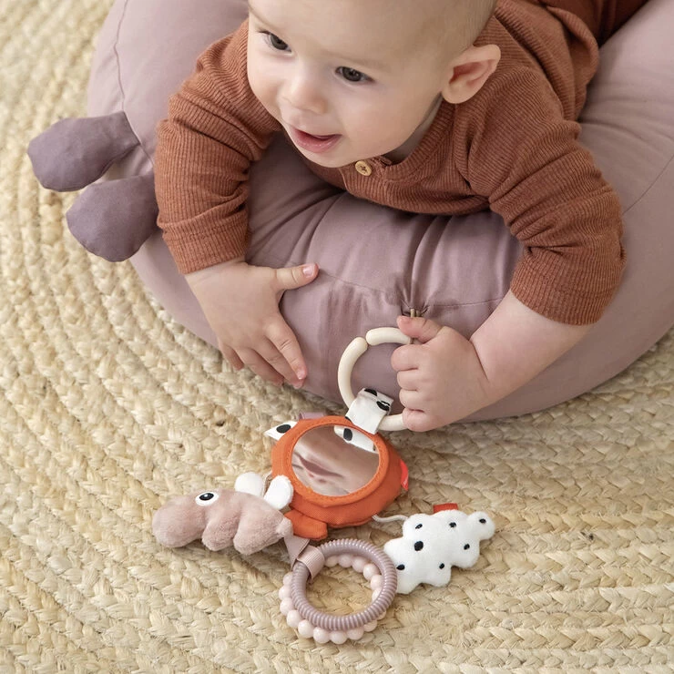 To go aktivitetsspejlet med Happy clouds vil gøre din baby nysgerrig efter at undersøge de spændende, sansestimulerende funktioner. Ozzo vil gøre hvad end der skal til for at din baby føler sig underholdt. Aktivitetsspejlet har en ballon-rangle, en blød Ozzo, en sky, to ringe med sjove teksturer og søde mærker. Barnet kan nemt gribe ringene og holde fast i spejlet. Brug en legetøjsring til at fastgøre den til barnevogn, autostol eller klapvogn. Det papayafarvede aktivitetsspejl vil med alle sine legesyge elementer sikre en dejlig leg for de små. Den papayafarvede ballon flyver afsted med en pudderfarvet Ozzo, to ringe i nuancer af pudder og en sød, hvid sky med sorte prikker.