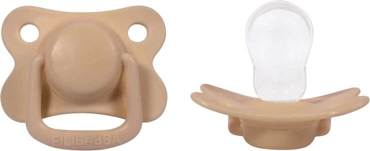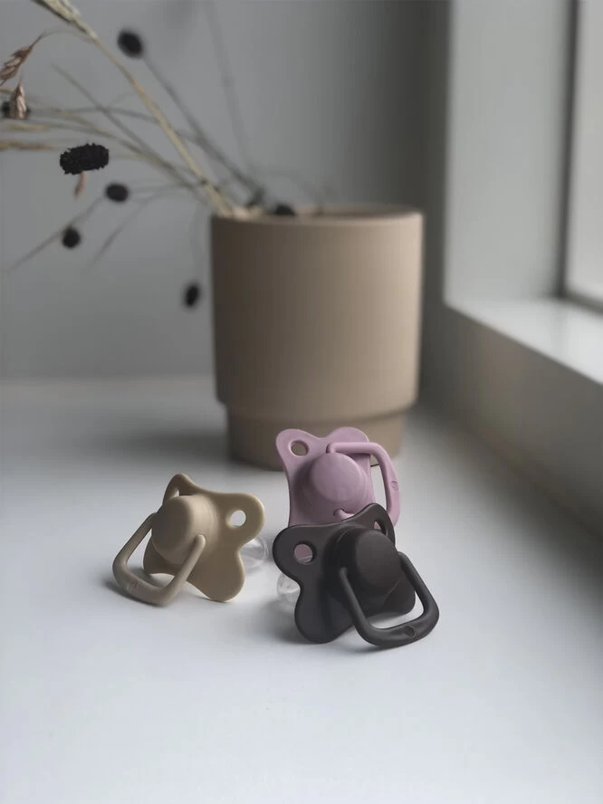 Filibabba Moments sut med symmetrisk suttehoved lavet af silikone. Sutterne findes i 15 smukke farver og i to forskellige størrelser, 0-6 mdr. og +6 mdr.