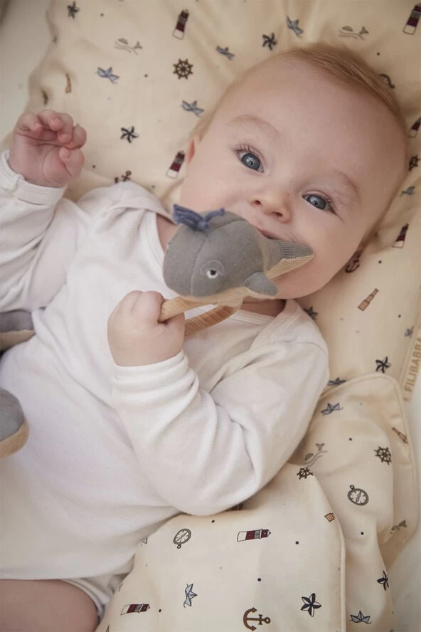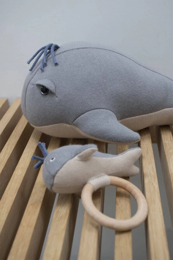 Willie the whale rattle er blot et af vores mange dyr, som er designet med den nordiske natur i tankerne. Med hjertet i hvert dyr har vi skabt en kollektion, med en masse fine og genkendelige nordiske dyr, til udsmykning på børneværelset og til mange timers leg. Willie the whale rattle er en sød håndlavet strikket hval, designet med en lille klokke indeni som giver en fin lyd når den rystes, samt blå bånd der illustrerer vandsprøjt. Hvalen er påsyet på en træring og fungere dermed som en rangle. Den giver et godt greb til selv helt små hænder. Hvalen er strikket i blødt 100% økologisk bomuld med fin struktur, og fyldt med 100% genanvendt polyester. Med sit søde ansigt skaber hvalen hurtigt en relation til barnet. Et fint aktivitetstlegetøj der både stimulerer barnets syns- og høresans og udvikler barnets finmotorik. Da hvalen er håndlavet, kan udtrykket variere lidt fra billedet.