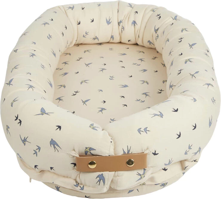 Det nye print Dancing Swallow er inspireret af vores skandinaviske baggrund og med udgangspunkt i naturen varme sommeraftener hvor svalerne leger i de sidste solstråler. Svalen er et symbol på forårets komme og at lysere tider er på vej, og det siges, at den lille fugl bringer lykke, hvis man er så heldig at have den boende. De små farverige detaljer i svalerne skaber en perfekt kontrast til den rolige baggrundsfarve. Dancing Swallow kommer i to spændende farvekombinationer og er håndtegnet med masser af kærlighed. Babynesten er produceret i økologisk satinvævet bomuld, som er ultrablødt og smukt at se på. Vores babynest er designet med lynlås-funktion, som giver mulighed for at lyne kanten af og bruge denne som sengerand, når baby vokser ud af babynesten, men stadig har brug for at føle sig omsluttet. Kan tilmed åbnes og lukkes i enden med et læderbælte, hvilket forlænger babynestens levetid, og er designet uden snore for at sikre barnet på bedste vis. Vigtigt Sørg altid for at babynesten ligger på en plan overflade, og at barnet er under opsyn og vend altid barnet med hovedet modsat lukningen.