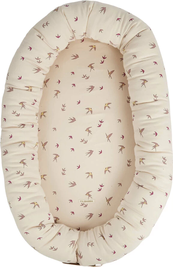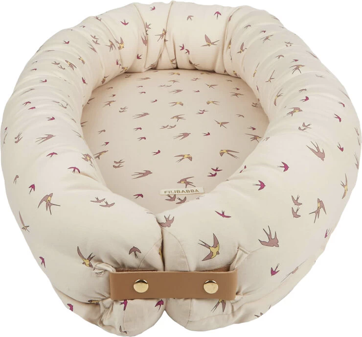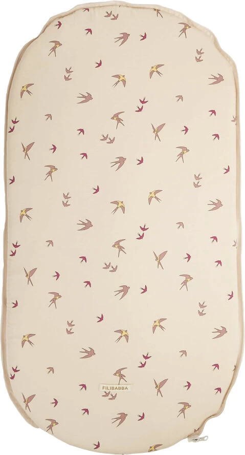 Det nye print Dancing Swallow er inspireret af vores skandinaviske baggrund og med udgangspunkt i naturen varme sommeraftener hvor svalerne leger i de sidste solstråler. Svalen er et symbol på forårets komme og at lysere tider er på vej, og det siges, at den lille fugl bringer lykke, hvis man er så heldig at have den boende. De små farverige detaljer i svalerne skaber en perfekt kontrast til den rolige baggrundsfarve. Dancing Swallow kommer i to spændende farvekombinationer og er håndtegnet med masser af kærlighed. Babynesten er produceret i økologisk satinvævet bomuld, som er ultrablødt og smukt at se på. Vores babynest er designet med lynlås-funktion, som giver mulighed for at lyne kanten af og bruge denne som sengerand, når baby vokser ud af babynesten, men stadig har brug for at føle sig omsluttet. Kan tilmed åbnes og lukkes i enden med et læderbælte, hvilket forlænger babynestens levetid, og er designet uden snore for at sikre barnet på bedste vis. Vigtigt Sørg altid for at babynesten ligger på en plan overflade, og at barnet er under opsyn og vend altid barnet med hovedet modsat lukningen.