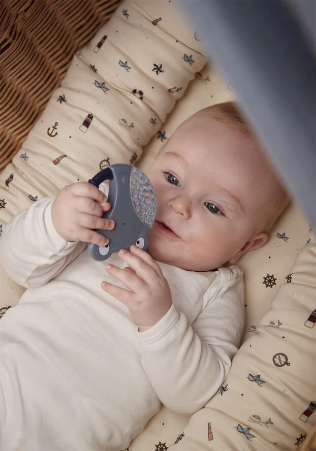 Smarte kølebideringe formet som søde frøer i rolige farver. Kølebideringene er fyldt med sterilt vand og lindrer barnets ømme gummer ved tandfrembrud. Det lille håndtag med struktur gør det nemt for barnet selv at gribe om ringen. Bideringene er designet med spændende strukturer og former, som stimulerer både mund og hænder. Bideringene har en rolig klokkelyd, så de også fungerer som rangler. For at opnå den kølende effekt lægges bideringen i køleskabet. Brug aldrig fryser til nedkøling. Med denne smarte 2-pak kan du altid have en bidering klar i køleskabet til ømme gummer.