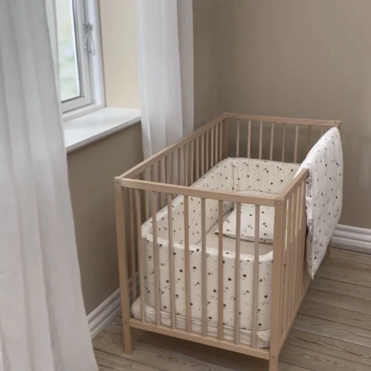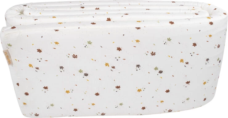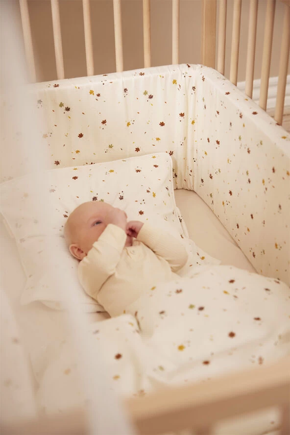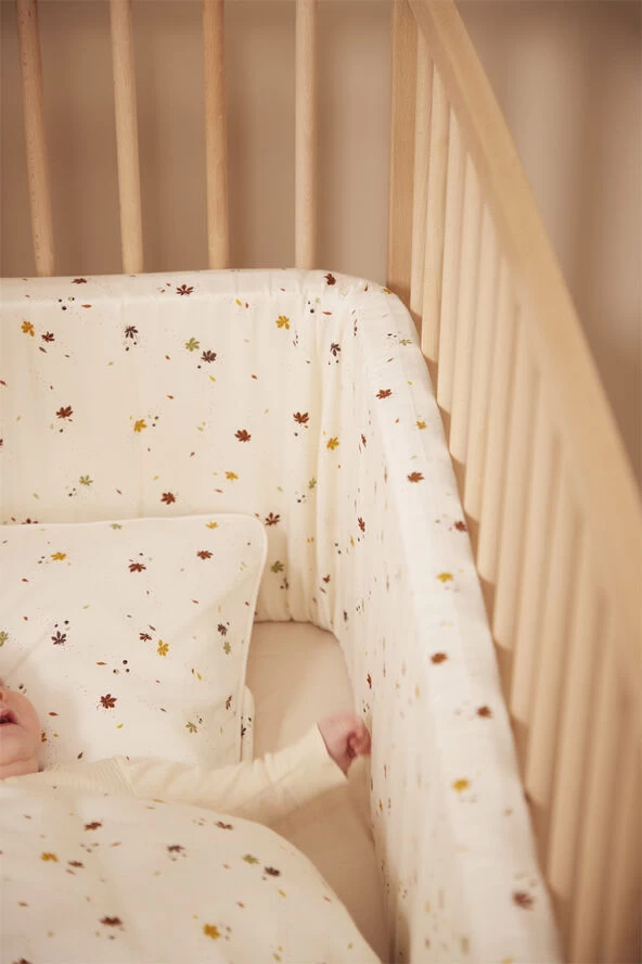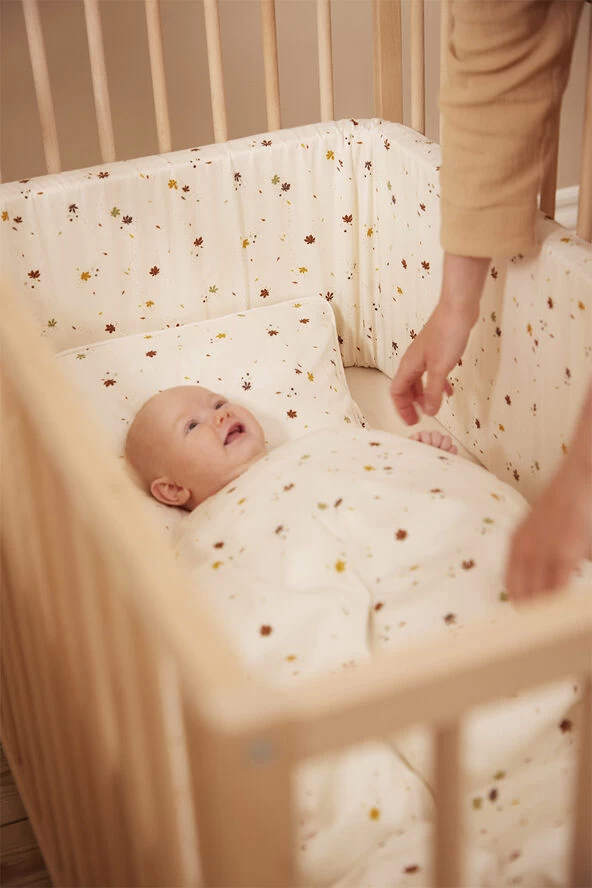 Match dit sengesæt med vores sengerand med et betræk af 100% GOTS-certificeret økologisk bomuld og det fine Chestnuts mønster. Vores sengerand er designet til at skabe en hyggelig stemning i enhver krybbe og tremmeseng. Hvis din seng er mindre, skal du blot lægge sengerandens ender over hinanden. Den 4 cm tykke polyesterskumkerne hjælper sengeranden med at stå oprejst, så du ikke skal fastgøre den til sengen med f.eks. bånd. Derudover sikrer den ekstra tykke kvalitet, at din baby ikke slår hovedet ind i sengens hårde tremmer. Den integrerede lynlås hjælper dig med at tage betrækket af, så du kan vaske det efter behov. Husk at trække betrækket i form og putte det direkte på skumkernen efter vask. Lad betrækket tørre på sengeranden for at mindske risikoen for, at det krymper.