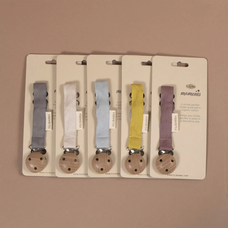 Fin og enkel suttesnor produceret i økologisk bomuld med nikkel-fri metalclips og træ-detalje. Sættes fast på sutten med silikonering. Findes i 5 smukke farver og 2 prints. Godkendt iht. EN 12586