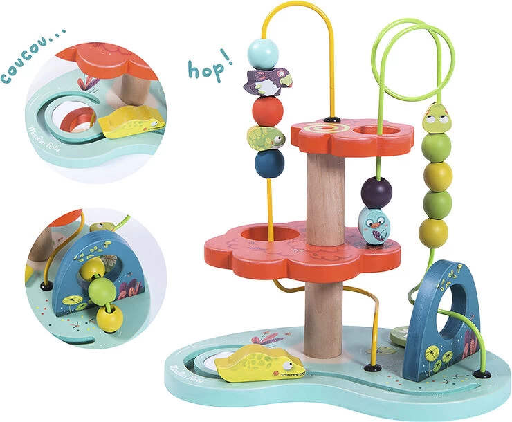 Dette farverige trælegetøj hjælper børn med at udvikle deres motoriske færdigheder. Der er også et lille spejl for at fremme selvkendelse. Produkt: L:26 x D:15,5 x H:27 cm. Alder: 1+