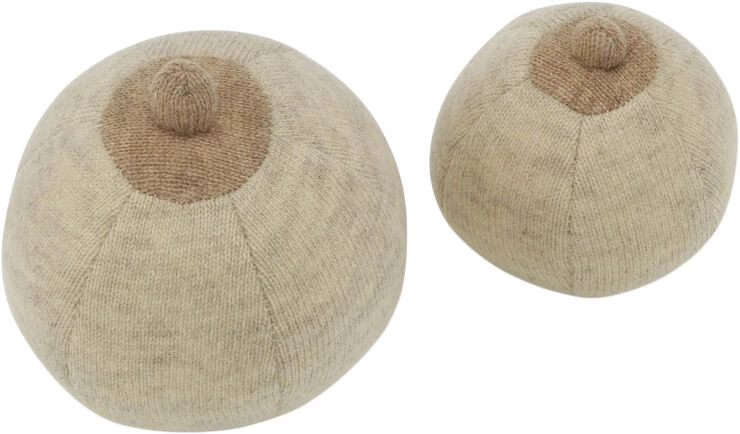 “Rolling boobies made in 80 percent wool and 20 percent nylon. Designed with a bell inside.”