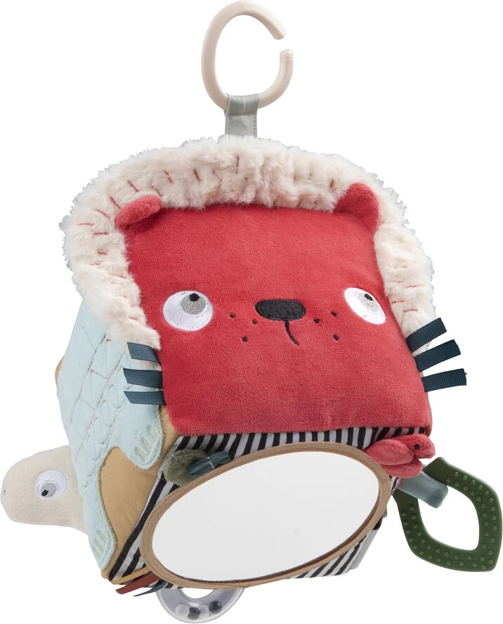 Blød aktivitetskube i stof med babyspejl, bidering og sjove teksturer. Denne underholdende aktivitetsklods er skabt til den første leg, til at begejstre babyer og stimulere deres nysgerrighed. Perfekte til legetid på maven og som tidligt legetøj, som barnet kan gribe ud efter og øve hånd-øje koordination med. Kuben er bløde at røre ved på grund af skumfyldet, og har interessante teksturer og funktioner, som barnet kan udforske. Barnet møder forskellige dyr rundt omkring på den store aktivitetskube – løven Lee, aben Maci, skildpadden Turbo, kamæleonen Carley og dovendyret Lacey. På den ene side er en bideringen fastgjort i poten på dovendyret. Bideringen er lavet af plastmateriale, der naturligvis er fri for BPA, ftalat og formamid. Bideringen er perfekt, når de første tænder melder deres ankomst og gummerne klør. På en anden side kan barnet finde et sikkert babyspejl. Her kan barnet lære sig selv at kende og udforske ansigtet og mimiker. Anbefalet alder: 0+. Mærkning: CE, UKCA. Vaskeanvisning: håndvask. Advarsel. Må ikke anvendes i nærheden af åben ild. OBS! Kvælningsfare: Fjern beskyttelsesfilmen fra spejlet inden du giver legetøjet til barnet.