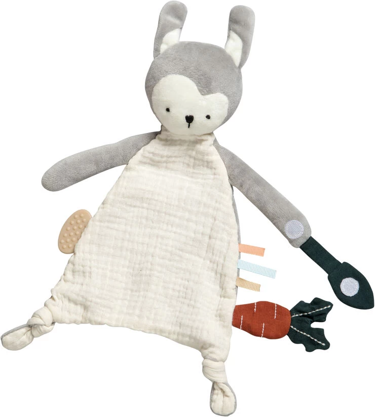 Blød nusseklud udformet som kaninen Siggy, med sutteholder og små, søde sensoriske aktivitetsdetaljer. Den bløde sutteklud kan hurtigt blive en uundværlig “”bamse””, som skaber tryghed og genkendelighed både ved sovetid, hyggestunder og når der er brug for trøst. Forskellige teksturer og nuller-tags giver barnet mulighed for sansestimulering når taktiliteten skal udforskes og mærkes. Mærkerne har forskellige farver, så der også er lidt for synssansen. Bideringen, som sidder på kaninens ene side, stimulerer og lindrer kløende gummer – især ved tandfrembrud. En velcro-lukning gør, at der kan sættes en sut fast på nussekluden, så den ikke bliver væk eksempelvis hvis barnet har kluden med på tur – i indkøbsvognen, autostolen eller barnevognen. Aktivitetsnussekluden hjælper med til at styrke og udfordre: Følesansen – når barnet mærker teksturer, blødhed og hårdhed samt forskellige materialer Synssansen – når barnet oplever farver og teksturer Smagssansen – når barnet bider i eller sutter på produktet og mærker elementerne smager / føles forskellige Grov og fin motorik – når barnet griber fat om produktet og senere hen udforsker de forskellige nuller-tags. Anbefalet alder: 0+. Mærkning: CE, UKCA. Advarsel. Må ikke anvendes i nærheden af åben ild.