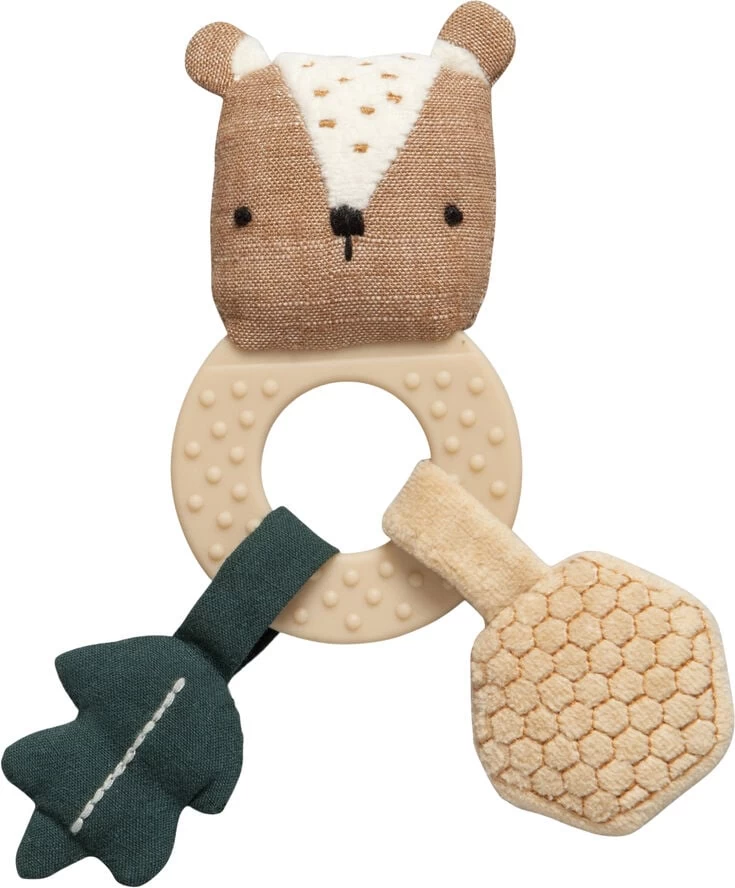 Lækker aktivitetsrangle med sensoriske aktivitetsdetaljer, udformet som bjørnen Milo. Milos hoved er lavet af stof og en ring med knopper udgør dens krop. På ringen sidder der to aktivitetselementer – et blad og et stykke af en bikube. Aktivitetslegetøjet er særdeles egnet som barnets første rangle. Ranglens størrelse passer godt i babyens hånd. Aktivitetsranglen hjælper med til at styrke og udfordre: Følesansen – når barnet mærker teksturer, blødhed og hårdhed samt forskellige materialer. Synssansen – når barnet oplever, kontraster, farver og teksturer. Smagssansen – når barnet bider i eller sutter på produktet og mærker at elementerne smager / føles forskellige. Grov og fin motorik – når barnet griber fat om produktet og senere hen udforsker de forskellige nuller-tags. Høresansen – når barnet lytter til ranglens lyd. Anbefalet alder: 0+. Mærkning: CE, UKCA. Advarsel. Må ikke anvendes i nærheden af åben ild.
