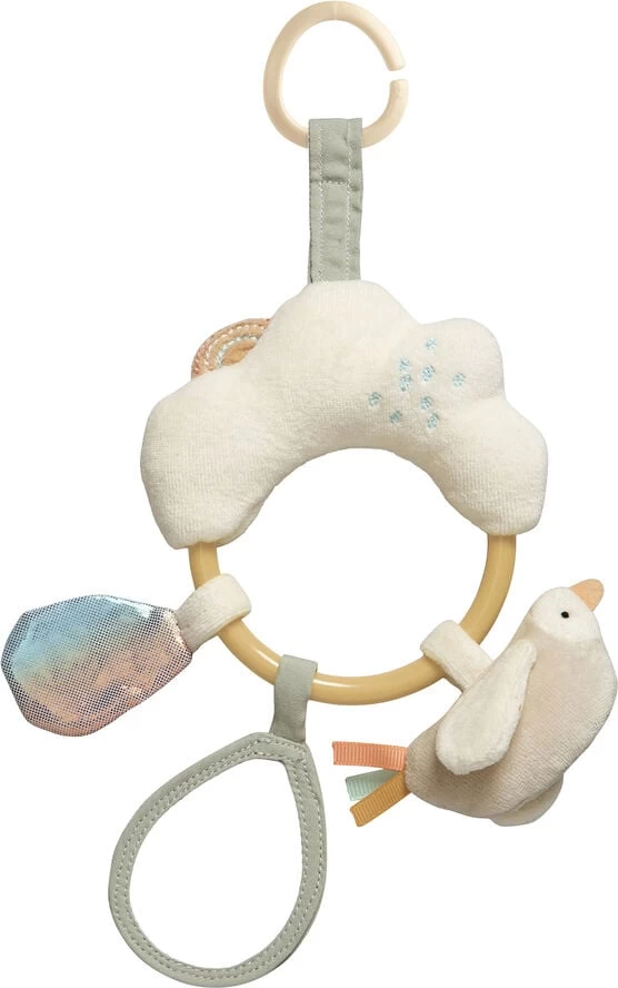 Smuk og sjov aktivitetsring med spejl, som kan bruges til ophængning. På aktivitetsringen sidder der i toppen fin sky med en lille regnbue bag. I bunden hænger fuglen Bliss med nuller-tags som halefjer, en skinnende regndråbe med knitrepapir og et dråbeformet babyspejl. I toppen af skyen sidder der en C-ring, som gør, at aktivitetslegetøjet kan hænges på kalechen på barnevognen, klapvognen eller autostolen for at stimulere og aktivere barnets sanser under transport. Aktivitetsringen hjælper med til at styrke og udfordre: Følesansen – når barnet mærker teksturer, blødhed og hårdhed samt forskellige materialer. Synssansen – når barnet oplever, kontraster, farver og teksturer. Selvforståelse – når barnet kan se sig selv i spejlet. Grov og fin motorik – når barnet griber ud efter eller griber fat om produktet og senere hen udforsker de forskellige nuller-tags. Høresansen – nar barnet lytter til aktivitetsringens lyd. Anbefalet alder: 0+. Mærkning: CE, UKCA. Advarsel. Må ikke anvendes i nærheden af åben ild. OBS! Kvælningsfare: Fjern beskyttelsesfilmen fra spejlet inden du giver legetøjet til barnet.