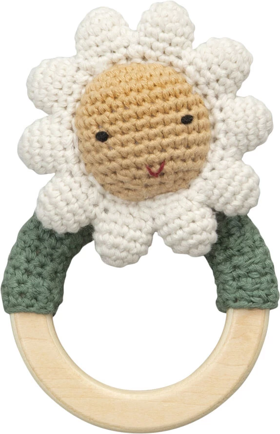 Håndhæklet blomsterrangle på træring, udført i økologisk bomuld og med genanvendt polyesterfyld. Blomsten hører til Sebras tema, Pixie Land – en fortælling om minivæsnerne pixierne og skovbundens mange glæder. Denne rangle, formet som en magueritlignende blomst er håndhæklet af økologisk bomuld. Inden i sig har den en klokke, som giver lyd når ranglen rystes. Ranglen er derudover fyldt med blødt, genanvendte polyester, som er sikret i en lille stofpose, der forhindrer fyldet i at finde vej ud gennem garnet. Blomsten er fastgjort på en træring, som halvt er dækket af det hæklede materiale, så det ligner blomstens stilke. Træringen gør det let for barnet at holde ranglen i hånden. Blomsten har hvide blomsterblade og en gul midte med et smilende ansigt. Ranglen er designet i Danmark, håndlavet og derfor er hver rangle unik og har hver sin charme. En perfekt gaveide til det første barselsbesøg. Anbefalet alder 0+. Mærkning: CE, UKCA. Vaskeanvisning: Overfladevask – håndvask. Advarsel. Må ikke anvendes i nærheden af åben ild. Om temaet Pixie Land Pixie Land tager barnet med ind i en hyggelig og nostalgisk fortælling om de små minivæsner pixierne, som med stor begejstring bevæger sig rundt mellem skovbundsplanter, bærbuske, nedfaldne agern og kastanjer. Naturen og skovens magi skaber rum at fordybe sig i, og med mariehøns, græshopperne og andre krible-krable dyr, som trofaste hjælpere, samler pixierne naturens mange gaver ind. Pixie Land handler om fællesskabet og om at give. Det er en verden, hvor der er tid til at lade tankerne vandre, hvor der er plads til fordybelse, og hvor begejstrings glæde over at have fundet et modent skovjordbær eller et firkløver, i virkeligheden er essensen af det hele. Om økologisk bomuld Garnet i dette produkt er lavet af økologisk bomuld – et valg som er truffet for at reducere produktets miljøaftryk. Mange af de miljømæssige konsekvenser, der kan være forbundet med produktion af bomuld, kan reduceres eller elimineres ved dyrkning af økologisk bomuld. Om genanvendt polyesterfyld Fyldet er lavet af 100 % genanvendt polyester fra plastikflasker, som er blevet indsamlet og rengjorte, hvorefter de strimles, omsmeltes og laves til nye genanvendte fibre. Plastikflaskerne får derved et nyt liv i stedet for bare at ende som affald.