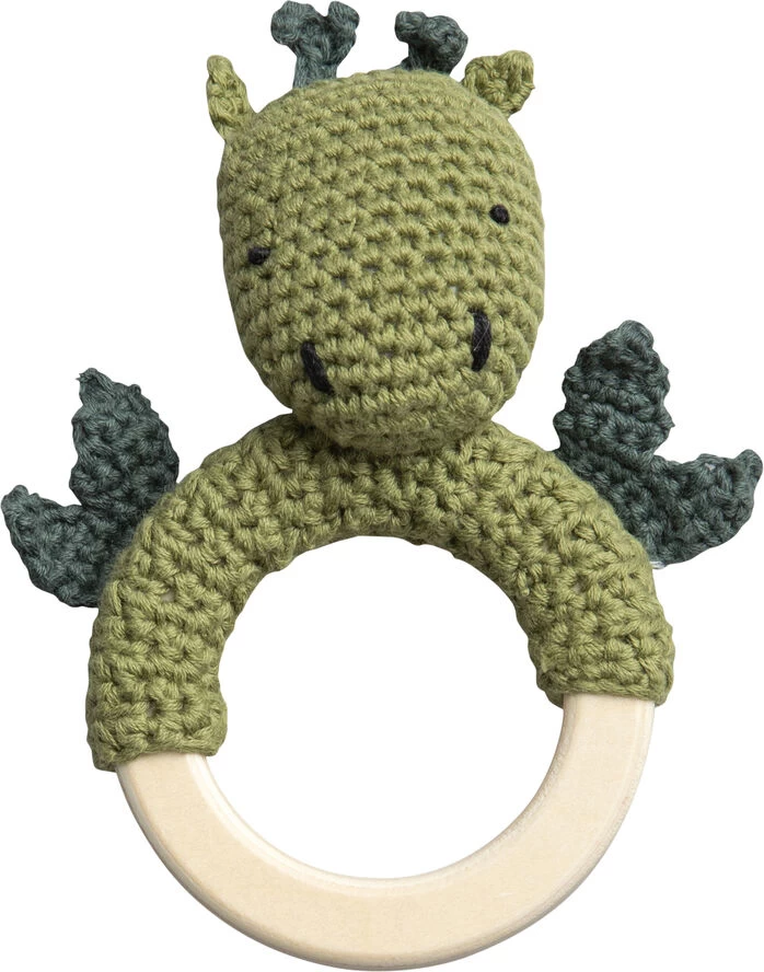 Håndhæklet dragerangle på træring, udført i økologisk bomuld og med genanvendt polyesterfyld. Dragen hører til Sebras tema, Dragon Tales – en fortælling om drager og riddere. Denne rangle, formet som drage, er håndhæklet af økologisk bomuld. Inden i sig har den en lille klokke, som giver lyd når ranglen rystes. Ranglen er derudover fyldt med blødt, genanvendte polyester, som er sikret i en lille stofpose, der forhindrer fyldet i at finde vej ud gennem garnet. Dragen er fastgjort på en træring, som halvt er dækket af det hæklede materiale, så det ligner dens overkrop, hvorpå dragevinger også er fastgjort. Træringen gør det let for barnet at holde ranglen i hånden. Dragen har en mørkegrøn farve med mørkeblå og sorte detaljer. Ranglen er designet i Danmark, håndlavet og derfor er hver rangle unik og har hver sin charme. En perfekt gaveide til det første barselsbesøg. Anbefalet alder 0+. Mærkning: CE, UKCA Vaskeanvisning: Overfladevask – håndvask. Advarsel. Må ikke anvendes i nærheden af åben ild. Om temaet Dragon Tales Med små fortællinger inviteres barnet ind i et rigtigt drageunivers. Her møder barnet skovdrager, slotsdrager, flyvende drager, sultne drager og ildspyende drager. Sammen med hver deres loyale ridder udforsker dragerne de snedækkede bjergtoppe, langsomt rindende åer, dybe blå skovsøer og vulkaner i udbrud. De begiver sig ud på eventyr, og besøger landsbyer og slotte. Dragon Tales er små fortællinger om venskaber, om at kunne leve sammen trods store forskelligheder, og om lysten til at opleve og udforske nye områder. Om økologisk bomuld Garnet i dette produkt er lavet af økologisk bomuld – et valg som er truffet for at reducere produktets miljøaftryk. Mange af de miljømæssige konsekvenser, der kan være forbundet med produktion af bomuld, kan reduceres eller elimineres ved dyrkning af økologisk bomuld. Om genanvendt polyesterfyld Fyldet er lavet af 100 % genanvendt polyester fra plastikflasker, som er blevet indsamlet og rengjorte, hvorefter de strimles, omsmeltes og laves til nye genanvendte fibre. Plastikflaskerne får derved et nyt liv i stedet for bare at ende som affald.
