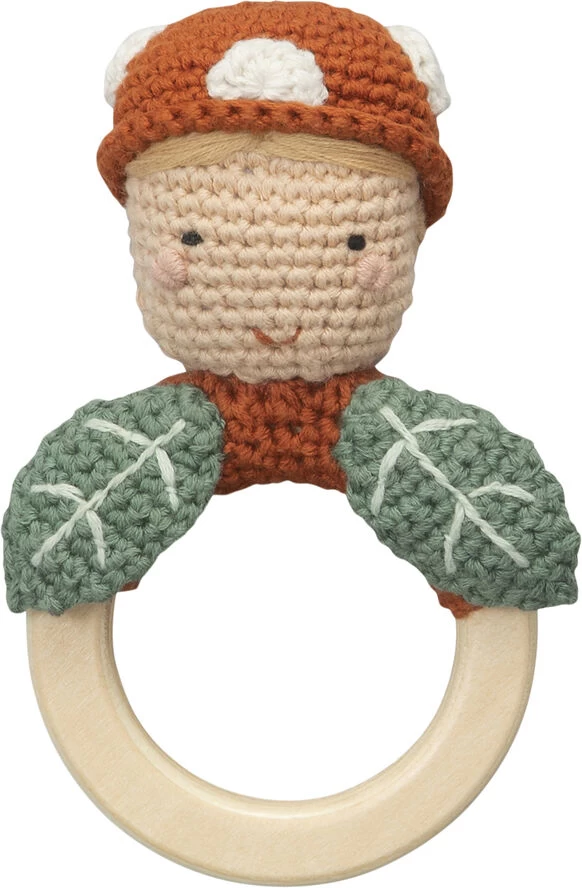 Håndhæklet rangle med en Pixie på træring, udført i økologisk bomuld og med genanvendt polyesterfyld. Ranglen hører til Sebras tema, Pixie Land – en fortælling om minivæsnerne pixierne og skovbundens mange glæder. Denne rangle, formet som en Pixie med svampehat og blade er håndhæklet af økologisk bomuld. Inden i sig har den en klokke, som giver lyd når ranglen rystes. Ranglen er derudover fyldt med blødt, genanvendte polyester, som er sikret i en lille stofpose, der forhindrer fyldet i at finde vej ud gennem garnet. Pixien er fastgjort på en træring, som halvt er dækket af det hæklede materiale, så det ligner Pixiens tøj. Træringen gør det let for barnet at holde ranglen i hånden. Pixien har et smilende ansigt, en røde fluesvampe-lignende hat og blade, som en del af påklædningen. Ranglen er designet i Danmark, håndlavet og derfor er hver rangle unik og har hver sin charme. En perfekt gaveide til det første barselsbesøg. Anbefalet alder 0+. Mærkning: CE, UKCA. Vaskeanvisning: Overfladevask – håndvask. Advarsel. Må ikke anvendes i nærheden af åben ild. Om temaet Pixie Land Pixie Land tager barnet med ind i en hyggelig og nostalgisk fortælling om de små minivæsner pixierne, som med stor begejstring bevæger sig rundt mellem skovbundsplanter, bærbuske, nedfaldne agern og kastanjer. Naturen og skovens magi skaber rum at fordybe sig i, og med mariehøns, græshopperne og andre krible-krable dyr, som trofaste hjælpere, samler pixierne naturens mange gaver ind. Pixie Land handler om fællesskabet og om at give. Det er en verden, hvor der er tid til at lade tankerne vandre, hvor der er plads til fordybelse, og hvor begejstrings glæde over at have fundet et modent skovjordbær eller et firkløver, i virkeligheden er essensen af det hele. Om økologisk bomuld Garnet i dette produkt er lavet af økologisk bomuld – et valg som er truffet for at reducere produktets miljøaftryk. Mange af de miljømæssige konsekvenser, der kan være forbundet med produktion af bomuld, kan reduceres eller elimineres ved dyrkning af økologisk bomuld. Om genanvendt polyesterfyld Fyldet er lavet af 100 % genanvendt polyester fra plastikflasker, som er blevet indsamlet og rengjorte, hvorefter de strimles, omsmeltes og laves til nye genanvendte fibre. Plastikflaskerne får derved et nyt liv i stedet for bare at ende som affald.