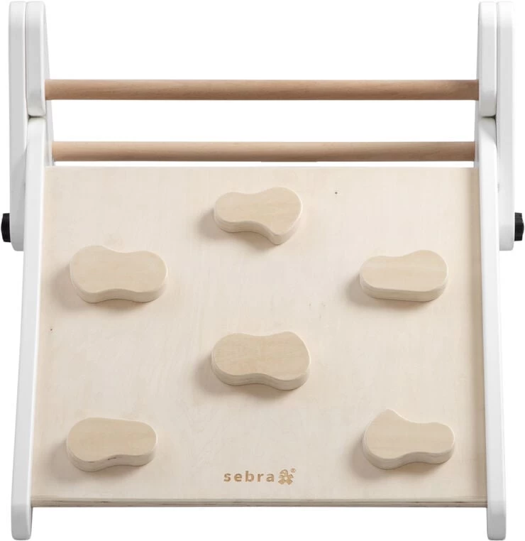 Klatretrekanten er designet med ribber på den ene side og seks robuste klatregreb på den anden side. Når barnet ikke bruger klatretrekanten, kan den nemt klappes sammen og opbevares f.eks. under Sebra Sengen.