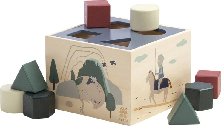 Sød puttekasse med illustrationer fra Sebras tema Dragon Tales – en fortælling om drager og riddere. Puttekassen har et låg med fire huller, formet som forskellige geometriske figurer. Trælåget er helfarvet og til puttekassen medfølger otte helfarvede klodser i fire forskellige nuancer og former: trekant, firkant, oval og sekskant. På puttekassens fire sider finder barnet fire små fortællinger og motiver af drager eller riddere. Legetøjet hjælper barnet med hånd-øjekoordination og lærer barnet at genkende former og farver. Brug puttekassen som dekoration når den ikke er i brug. Puttekassen er udført i en kvalitet, som kan gå i arv. Aktivitetslegetøjet er designet i Danmark. Anbefalet alder: 1+. Mærkning: CE, UKCA. Rengøring: aftørres med klud. Om temaet Dragon Tales Med små fortællinger inviteres barnet ind i et rigtigt drageunivers. Her møder barnet skovdrager, slotsdrager, flyvende drager, sultne drager og ildspyende drager. Sammen med hver deres loyale ridder udforsker dragerne de snedækkede bjergtoppe, langsomt rindende åer, dybe blå skovsøer og vulkaner i udbrud. De begiver sig ud på eventyr, og besøger landsbyer og slotte. Dragon Tales er små fortællinger om venskaber, om at kunne leve sammen trods store forskelligheder, og om lysten til at opleve og udforske nye områder.