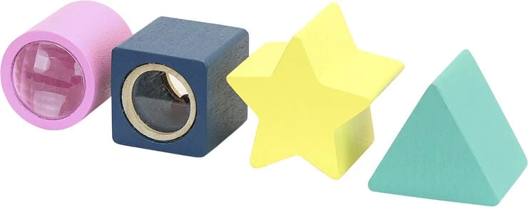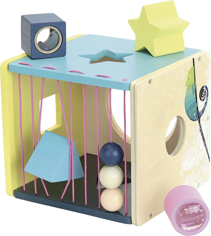 Puttekasse i lyst træ med snore, så barnet både kan putte formerne ind i de rigtige huller, men også igennem snorene. 4 farverige former med effekter: kaleidoskop, maracas, stjerne og trekant med lyd. Produkt: 16 x 16 x 16 cm Emballage: 17 x 17 x 17 cm Alder: 12-36 mdr